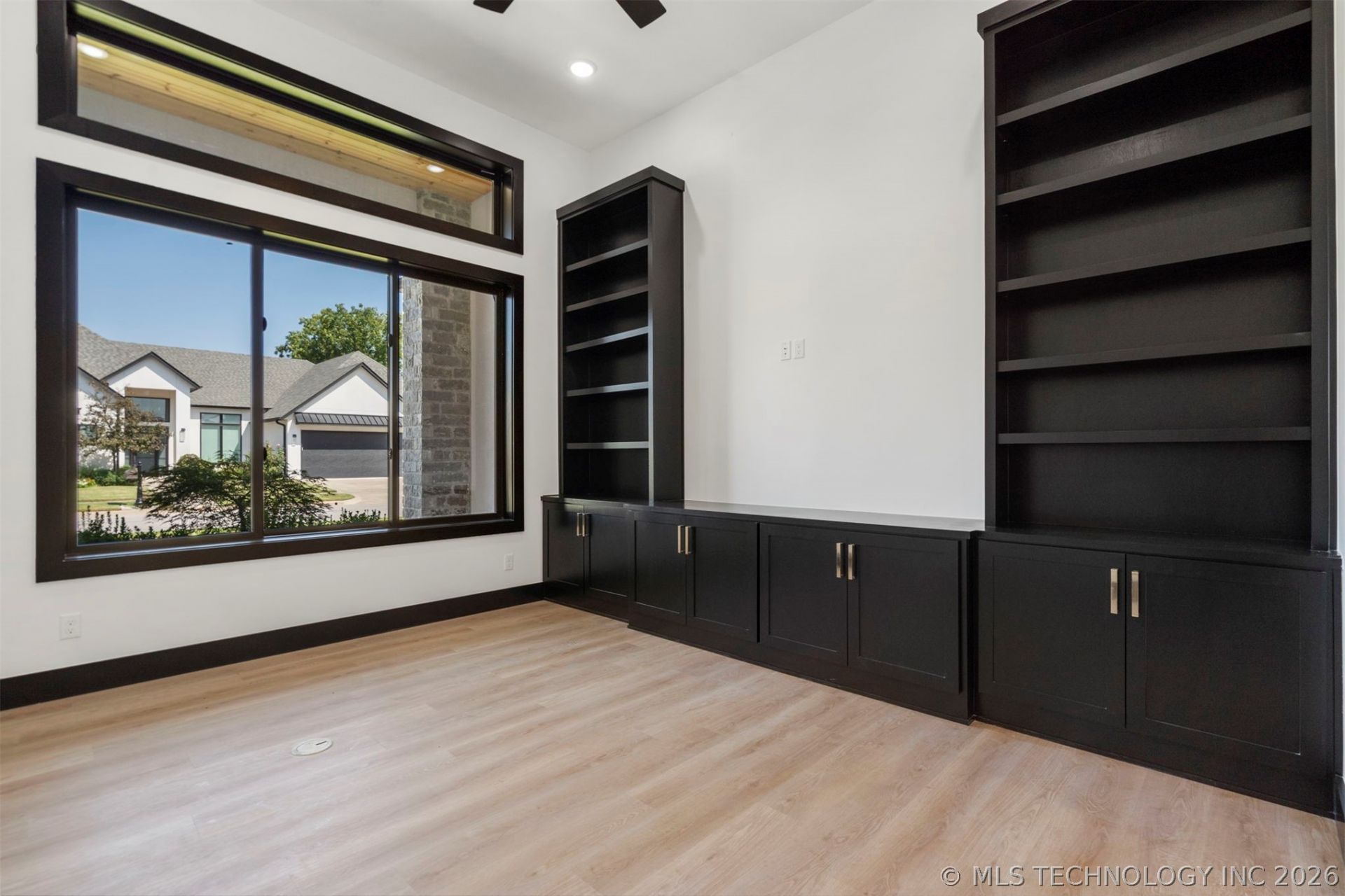 Look at this gorgeous SINGLE STORY contemporary style new construction home built by Perfection Homes by Wayne Farabough! The brand new home is situated on a 1/3 acre lot in Bixby's finest and highly desired gated community. This beautiful home features 3 bedrooms, 3 full and 1 half bathroom, oversized 3 car garage with so much storage. This is such an amazing large open floor plan with a private study/office, game/media room with wet bar, a large sliding glass door leads you to the outdoor kitchen on the covered patio with motorized Phantom retractable screens. As you walk in the custom iron doors to the grand 15' ceilings you will see the custom ceiling features with 3 elegant lighting fixtures for your first show stopping view! The gourmet kitchen has Bosch appliances and a huge oversized island with a second prep kitchen with another refrigerator. The master bedroom has a stunning accent wall and a true spa-like feel in the master bath with the walk-in shower/bath wet area. This home also has a safe room, stairway up to a huge floored attic area for storage. This builder really thought of everything for the max storage and use of this home! The laundry room is huge enough that you can have a gift wrapping or hobby area in it as well. It also features a built-in office desk with 2 file drawers on top of so many other cabinets and drawers, a sink, hidden hanging area for clothes and household supplies such as mops and brooms that can be put away properly and out of sight. This home literally has it ALL! Not a detail was overlooked! This custom built home truly represents the essence of elegant upscale living! This is the only and last completed home for sale in Wood Hollow Estates! There is only one lot left to build on and this neighborhood will be complete, so no more new construction. Call us to schedule your private tour of this one of a kind perfect single story floor plan today!